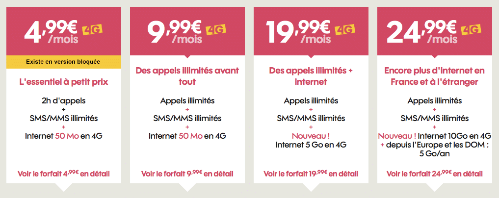 Des déclinaisons existent et bénéficient aussi de la promotion. Elles permettent d’améliorer le forfait mobile (appels illimités, volume mensuels de DATA plus élevé, …). Il faudra alors ajouter 5 à 15 euros / mois selon le forfait choisi.
